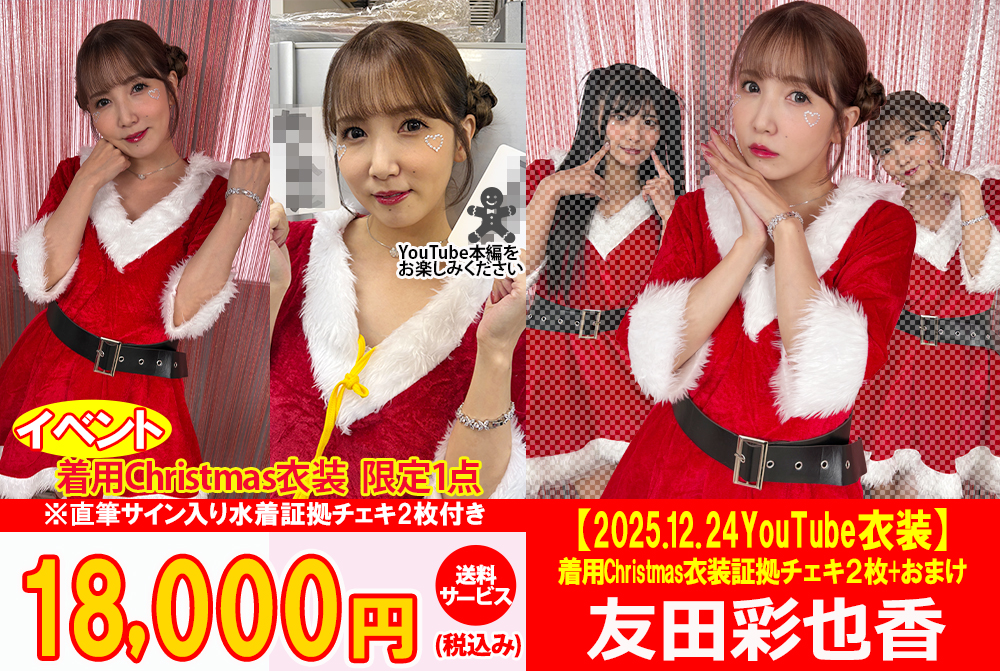 - 限定1点!「友田彩也香」が12.24 YouTube撮影時に着用したXmas衣装+直筆サイン入証拠チェキ2枚に本編で使用したカード(直筆サイン入り)が付いた世界に一つの商品です。