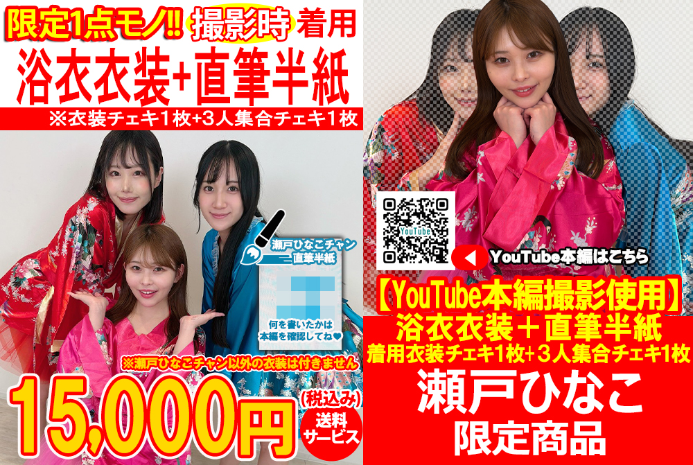 - 限定1点!「瀬戸ひなこ」がACTコラボYouTube時に着用した浴衣衣装+衣装着用直筆サイン入証拠チェキ1枚+3人集合チェキ1枚が付いた世界に一つの商品です。