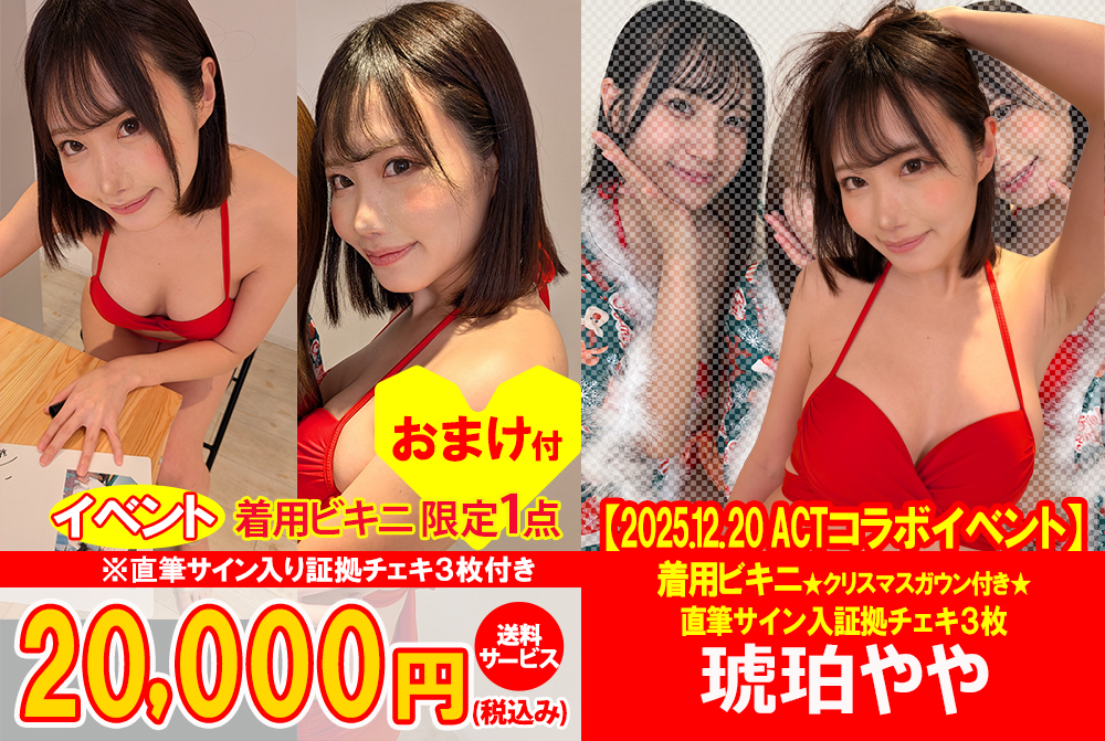 - 限定1点!「琥珀やや」がACTコラボイベント時に着用したビキニ(★クリスマスガウン付き)+直筆サイン入証拠チェキ3枚におまけが付いた世界に一つの商品です。