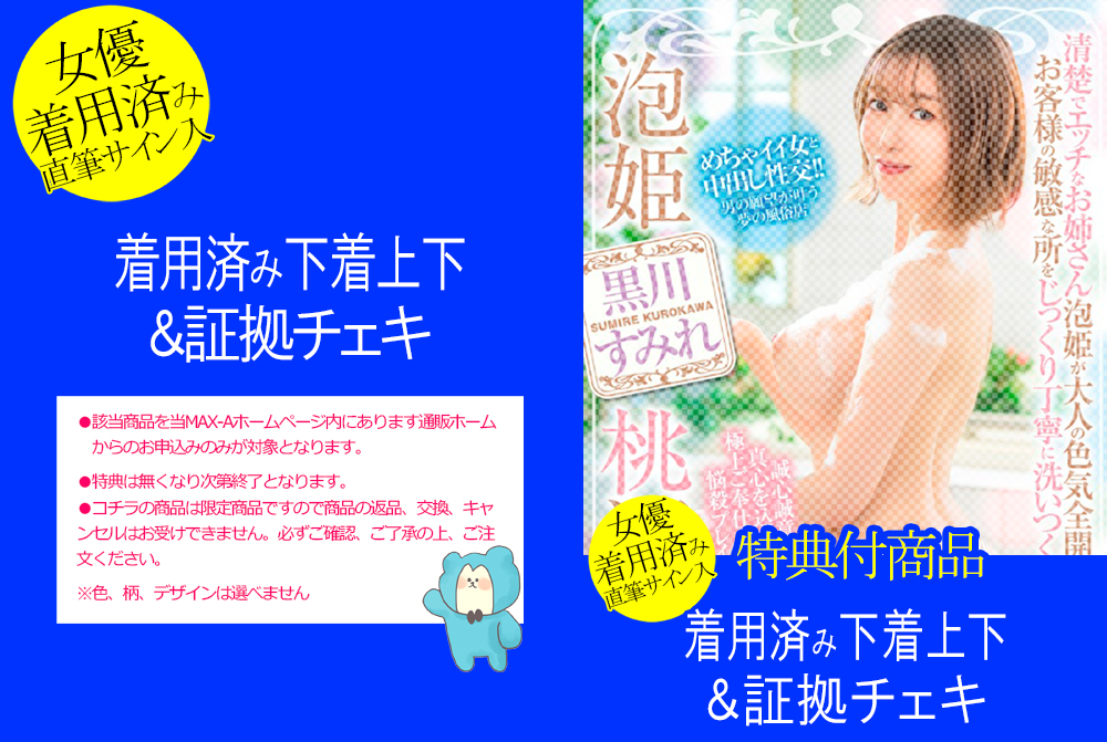 - 黒川すみれチャン特典付受注販売Blu-rayの数量限定!着用済み下着上下+証拠チェキ(サイン入)が付いてくる!!●限定商品につき、商品の返品、交換、キャンセルはお受けできません。必ずご確認、ご了承の上、ご注文下さい。 ●特典付Blu-rayはなくなり次第終了となります。 ※※2026/1/1(木)0:00予約受付スタート!!