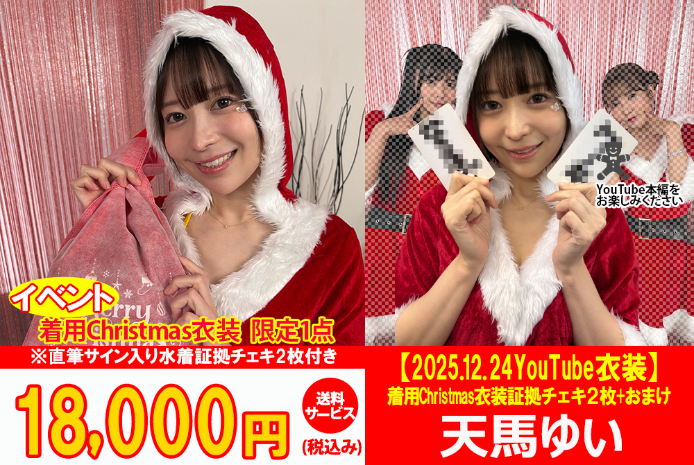 - 限定1点!「天馬ゆい」が12.24 YouTube撮影時に着用したXmas衣装+直筆サイン入証拠チェキ2枚に本編で使用したカード(直筆サイン入り)が付いた世界に一つの商品です。