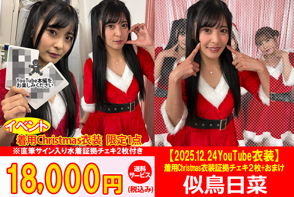 - 限定1点!「似鳥日菜」が12.24 YouTube撮影時に着用したXmas衣装+直筆サイン入証拠チェキ2枚に本編で使用したカード(直筆サイン入り)が付いた世界に一つの商品です。